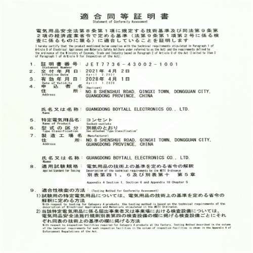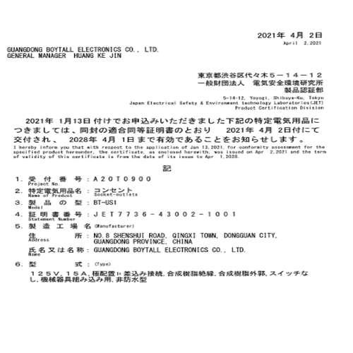 發布時間:2021-4-17 8:39:33 | 信息來源:廣東博滔電子有限公司恭賀博滔美式二孔,日本證書下來啦!